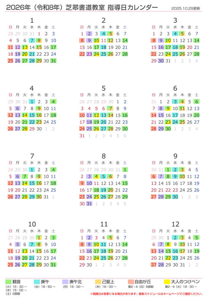 指導日カレンダーを不定期に更新していますので、レッスン日が近づいたら実際の開講日を