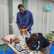 外国人選手が書道教室に来て下さいました。身長198cmらしく 手のひらも大きくて...続きを読む