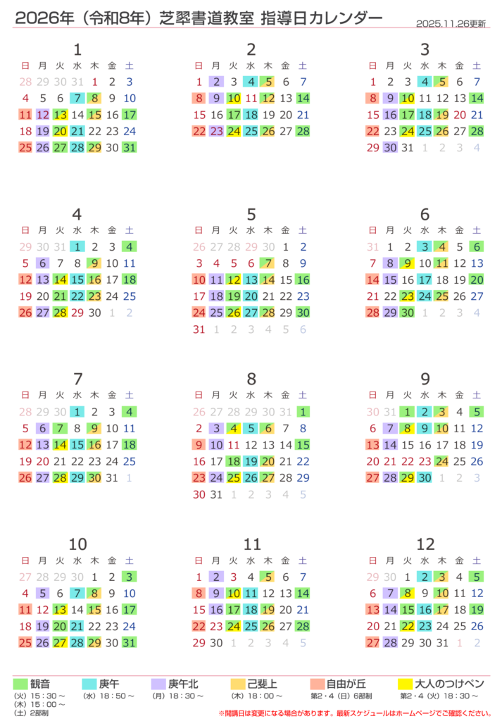 指導日カレンダーを不定期に更新していますので、レッスン日が近づいたら実際の開講日を