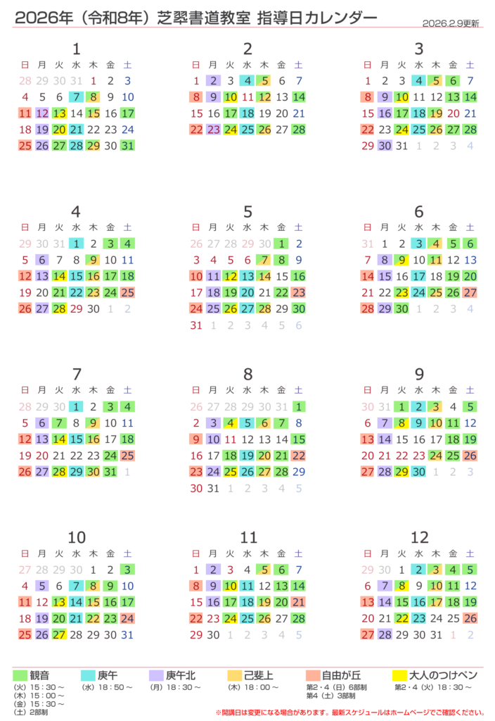 指導日カレンダーを不定期に更新していますので、レッスン日が近づいたら実際の開講日を
